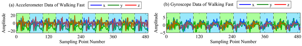 Accelerometer (a) and gyroscope (b) data of walking quickly.