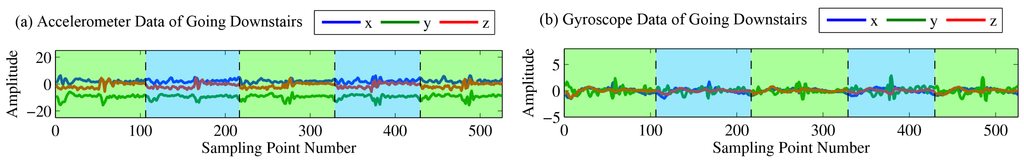 Accelerometer (a) and gyroscope (b) data of going downstairs.