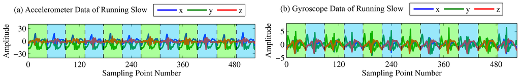 In this part, we illustrate several segments generated by hand-changing processes and activities of daily life. Whereafter, in Figure 12a,b, we plot the waveforms of the accelerometer and gyroscope data generated by hand-changing processes, including passing the smartphone from both the right hand to the left hand and the left hand to the right hand. In Figure 13a,b and Figure 14a,b, we plot the waveforms of the accelerometer and gyroscope data generated by walking slowly and quickly, respectively. In Figure 15a,b and Figure 16a,b, we plot the waveforms of the accelerometer and gyroscope data generated by going upstairs and downstairs, respectively. Finally, in Figure 17a,b and Figure 18a,b, we plot the waveforms of the accelerometer and gyroscope data generated by running slowly and quickly, respectively.