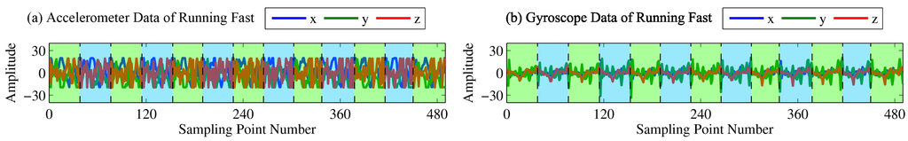 Accelerometer (a) and gyroscope (b) data of running quickly.