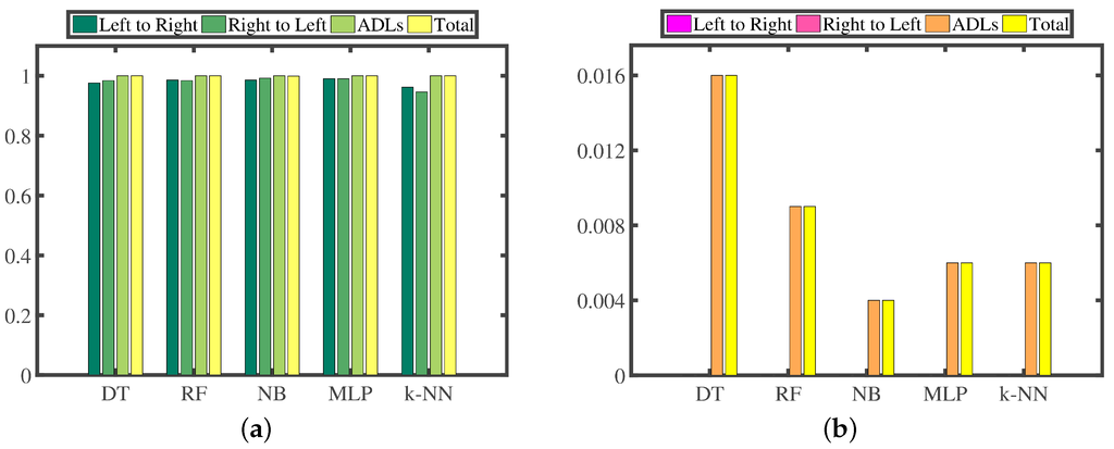 In this part, we construct five different classifiers [5,6], which are Decision Tree (DT) [7,8], Random Forest (RF) [9,10], Naive Bayes (NB) [11,12], Multi-Layer Perceptron (MLP) [13,14] and k-Nearest Neighbors (k-NN) [15,16], and compare their classification performance on our touchscreen traces data. The number of traces in each training subset and test subset is 40 and 10, respectively, in this part, so the total number of traces in the training set and the test set is 640 and 160. Table 3 shows the classification performance, and Figure 7 shows the total time (training time + test time) and FPR of these five classifiers. The x-axes of Figure 7a,b are different classifiers. The y-axes of Figure 7a,b are total time and FPR, respectively.