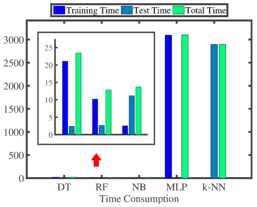 We can make two observations here. Firstly, on the one hand, MLP gives the best classification performance, which achieves 96.9% precision and 1.5% FPR, and RF gives the second best classification performance, which achieves 95.6% precision and 2.7% FPR. On the other hand, NB achieves the worst classification performance, and k-NN is also not good enough. Second, as shown in Figure 7, the total time of MLP is 1.41 s, but the total time of RF is only 0.04 s (almost 0 ms for every trace). The former is 35-times as long as the latter. After considering all factors above, we finally choose RF as our classifier in this paper, which is extremely effective for datasets containing many redundant features. As mentioned before, the time consumption of feature extraction is about 17 ms. The time consumption of the remaining steps is too short to measure. Therefore, for every trace, the whole recognition process can be accomplished within about 17 ms.