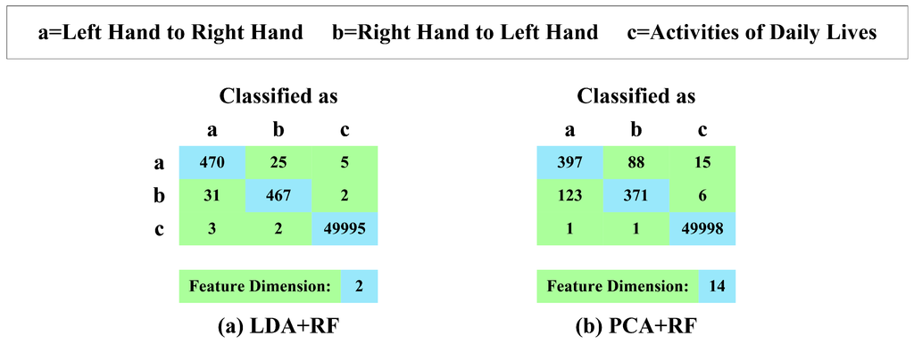 As for the recognition of the hand-changing process, there are four steps that mainly cause energy consumption. The first step is the acquisition of the accelerometer and gyroscope data. The power of the accelerometer is about 96 mW [71]. The power of the gyroscope is about 153 mW [72]. They are both low cost. Therefore, the energy consumption of the first step is only at about the thousand-Joule-level per hour. The second step is similar to the second step of the current operating hand recognition process. Therefore, we will not analyze it again here. The third step is the dimension reduction of the features. The training process of the linear discriminant analysis is offline. Then, the smartphone conducts only two linear transformations to transform high dimensional features into low dimensional features. Therefore, the energy consumption of the third step can be ignored. The fourth step is the same as the third step of the current operating hand recognition process. Therefore, we will not analyze it again here.