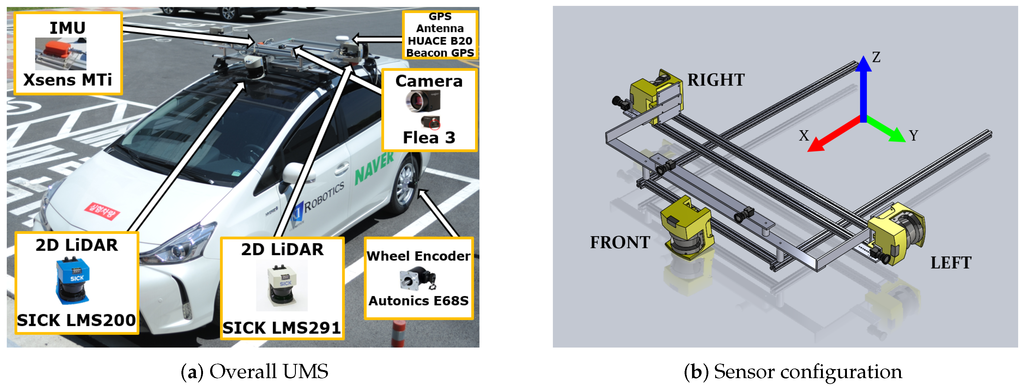 For accurate urban mapping, we developed a sensor suite called Urban Mapping System (UMS), which is mountable to a car-like platform. As shown in Figure 1a, the platform used for mapping was equipped with three Light Detection and Ranging (LiDAR) sensors, four cameras, a Global Positioning System (GPS), an Inertial Measurement Unit (IMU), an altimeter, and wheel encoders. The detailed specifications are summarized in Table 1. As in Figure 1, coordinates of each sensor were represented with respect to the vehicle center coordinates (red, green and blue arrows).