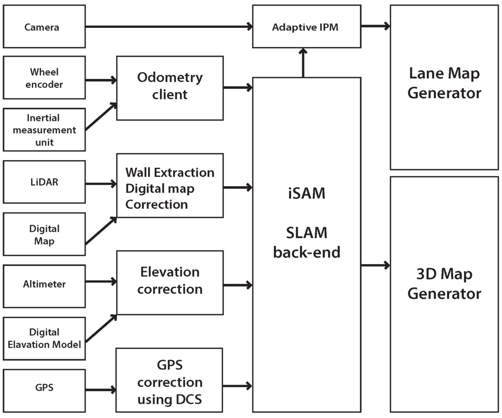 We propose a SLAM-based approach to localize the mobile sensor system mounted on a car-like platform and generate an accurate urban map consisting of a large amount of 3D points. For accurate localization, we use publicly available digital maps together with cameras, Light Detection and Ranging (LiDAR)s, and inertial sensors. Using this accurate localization, motion compensated Inverse Perspective Mapping (IPM) is applied for accurate lane-map generation. Given accurate localization, projections of front-looking cameras follow the construction of the lane map. For the lane map description, we propose an adaptive IPM algorithm to obtain accurate bird’s-eye view images from the sequential images of forward-looking cameras. These images are often distorted by the motion of the vehicle; even a small motion can cause a substantial effect on bird’s-eye view images.