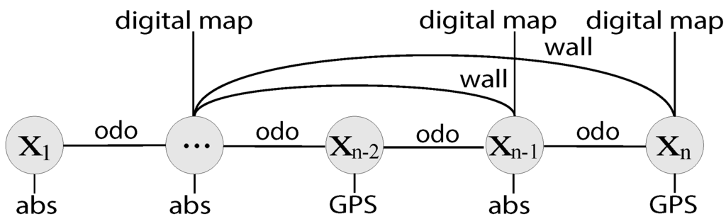 Depiction of the pose-graph SLAM factors. Odometry constraints (odo) are sequential whereas wall loop constraints (wall) can be non-sequential. Absolute constraints (abs) includes digital map correction and altimeter. GPS factors may occur irregularly. When wall is created, we also provide a digital map correction factor.