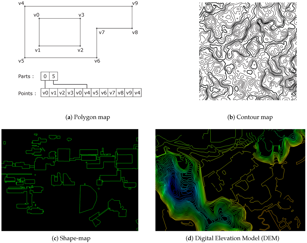 Shape file representations for building and contour. An example of polygon data type structure is in (a), and an example of contour map is in (b). (c) is sample shape-map (building) in the campus data. (d) is sample shape-map (DEM) in the campus data.