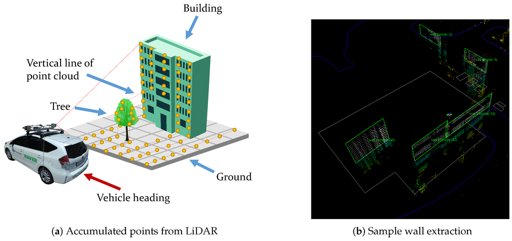 Conventional approaches in digital map generation rely on aerial sensors, including high-resolution aerial images, Light Detection and Ranging (LiDAR)s, and radars. Toward accurate building detection, point cloud data from aerial LiDAR has been widely used for a Digital Building Model (DBM) [11,12,13,14]. One line of study used only aerial imagery to extract building information [15,16], while merging the high-resolution aerial imagery and aerial LiDAR [17] has been introduced.