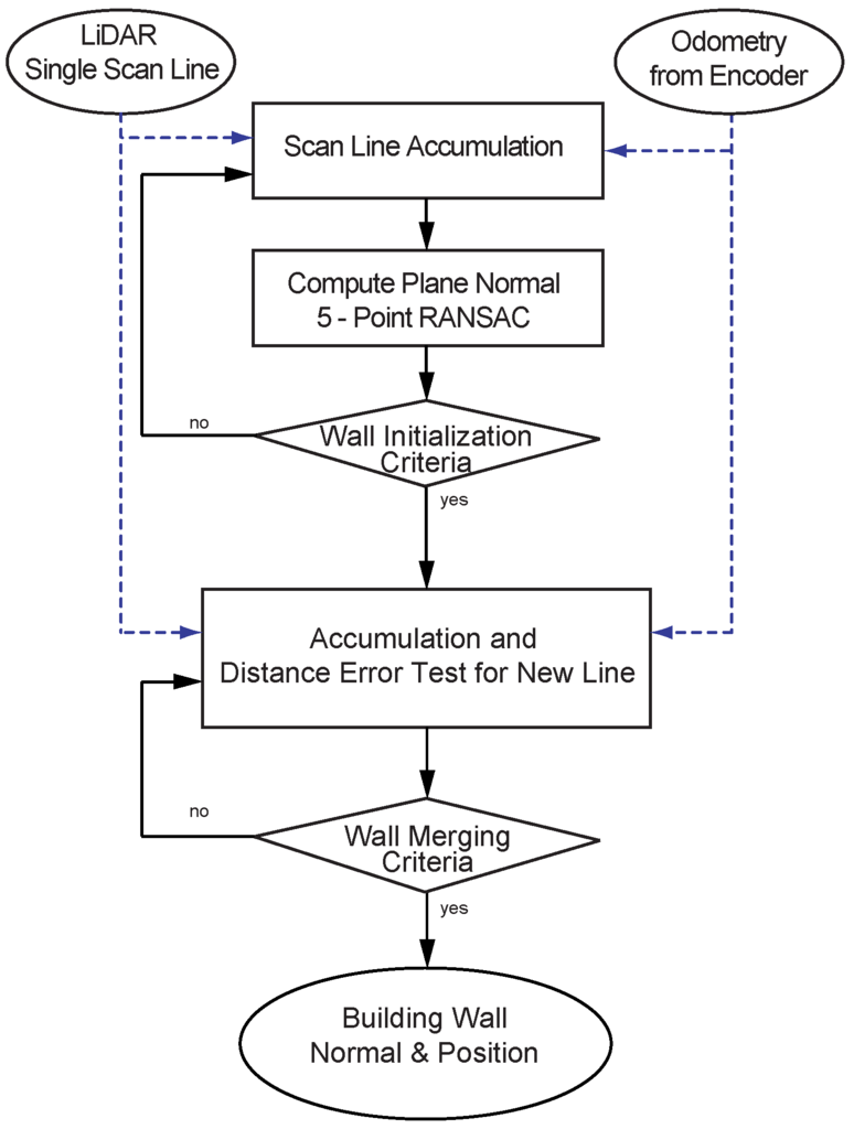 We propose a fast wall segmentation algorithm-based on RANSAC when segmenting a wall from a point cloud (summarized in Figure 6). For the incoming line of the point cloud, we fit a plane using a 5-point RANSAC. Our wall initialization criteria involve checking the wall width (initialization criteria in Figure 6). If the width of the created wall reaches our threshold (minimum 3 m), the algorithm initializes a wall and stores normal vector and error statistics for the wall. Once the initial wall is established, a newly incoming scan line is evaluated to be merged to the initial wall (merging criteria in Figure 6).