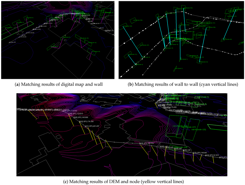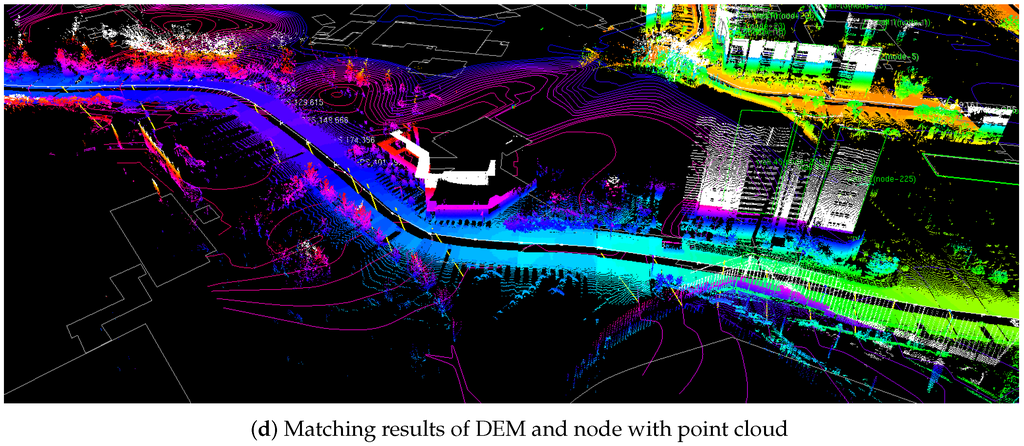 We also incorporate DEM for elevation information. For certain topographies, regions contain substantial elevation change. In general, the height of the terrain is represented by the contours. As presented in Figure 4d, points are connected by contour lines indicating the same height. The absolute height value of the contour is described in the attribute information of the shape-file. When the trajectory of the vehicle passes a contour, SLAM algorithm optimize position using absolute measurement of Z-direction from this absolute height.