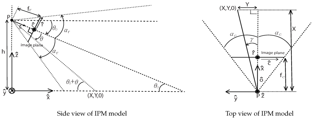 Side and top view of IPM model. In the illustration, and are the focal length of a camera; is the pitch angle; and are the half angle of the vertical and horizontal field of view (FOV) respectively. Reprinted, with permission, from Jeong et al. URAI 2016; ©2016 IEEE.