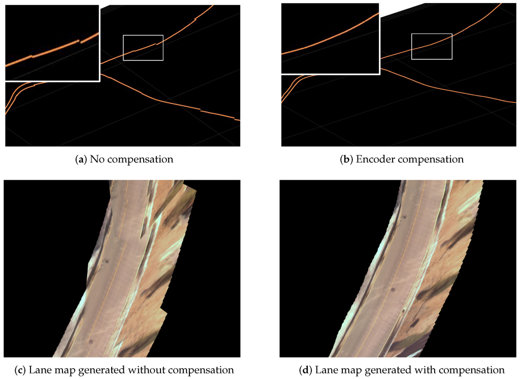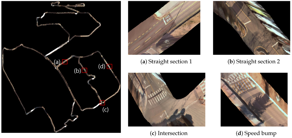 We also generate a lane map for urban mapping. Using the Simultaneous Localization and Mapping (SLAM) results and the previously introduced adaptive Inverse Perspective Mapping (IPM) model, we produce precise bird’s eye view images compensating for vehicle motion. To generate dense and precise lane map, additional vehicle positions are required because the average distance between nodes of SLAM result is 8.06 m. Additional vehicle position and heading angle are interpolated by using vehicle encoder data from nodes that generated by SLAM. Figure 16 shows the entire campus lane map with four representative samples (shown in a zoomed view). Note the consistency of the generated map by the IPM images back-projection.