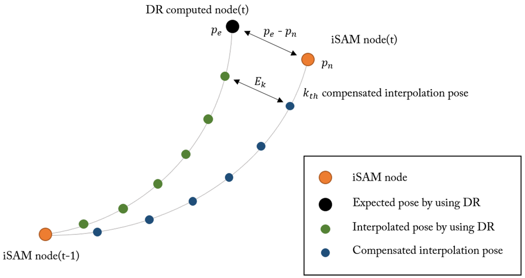 As shown in Figure 11, we compute the compensation value per section between nodes. For a section with two nodes on each end, we compared the Dead-Reckoned (DR) position and the SLAM-corrected node position . When there are n number of images in the section we apply compensation value for the position associated with image. The result of this interpolation is shown in Figure 10c,d. Note that the compensated projection demonstrates a more smooth and consistent lane map.