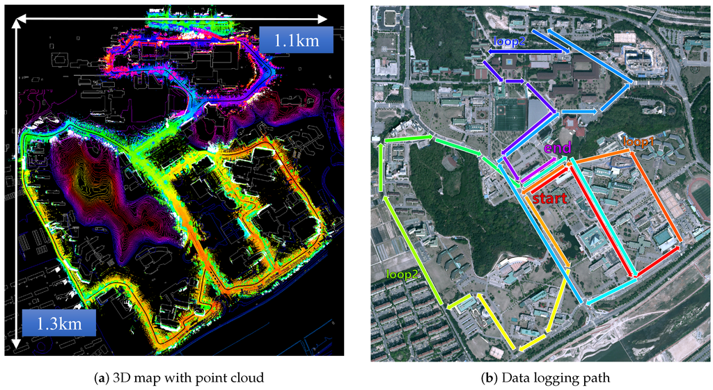 The aforementioned approaches use costly aerial sensors and have limitations in generating maps inside tunnels and multi-layered roads. For a cost-effective mobile mapping system, urban mapping systems similar to ours have been introduced in the literature [18,19,20,21]. Blanco et al. [18] presented a collection of outdoor datasets using a large and heterogeneous set of sensors comprising color cameras, several laser scanners, precise GPSs, and an IMU. Their posterior research [19] introduced a dataset gathered entirely in urban scenarios using a car equipped with one stereo camera and five laser scanners, among other sensors. Elseberg et al. [20] used a commercial data logging system and collected data with an experimental platform constructed by the RIEGL scanner [22]. Bok et al. [21] used a mobile mapping sensor system mounted on a ground vehicle. A vertical 2D LiDAR scans structures and the reconstruction is done by accumulating scanned data. All of the conventional approaches cover a small region, assuming a 2D environment without taking altitude information into account.