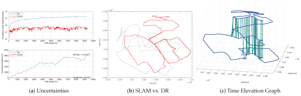 Proposed digital map-based SLAM results. (a) Uncertainty versus path length . Whereas the uncertainty of DR navigation (blue, dot) shows unbounded growth, the uncertainty of SLAM (red solid) is bounded from wall-to-wall loop closures. The graph at the top of the pose uncertainty with log-scale of y axis (unit: m·rad. The following [53,54,55], we use m·rad to show pose uncertainty), the bottom graph shows the position uncertainty (unit: m). (b) Top-down view of the SLAM estimate (red line) versus dead-reckoning trajectory (gray line). (c) The xy component of the SLAM trajectory estimate is plotted versus time, where the vertical axis represents mission time. Green lines show wall-to-wall matching for loop closure.
