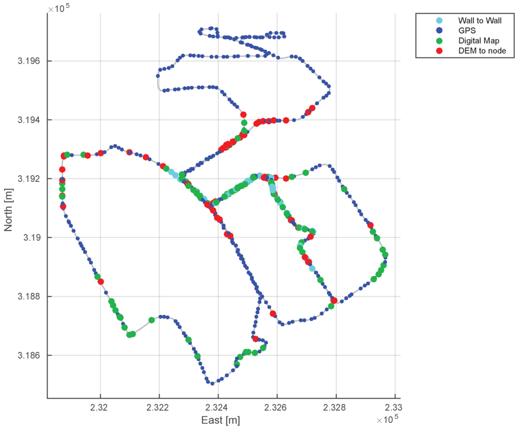Figure 14 visualizes the nodes by the sensor types for the entire trajectory. As the environment is with low level buildings, GPS signals (blue) are available for many nodes (41.4%). However, the signal is sporadic and vulnerable to the surrounding structures. When the GPS signal becomes unreliable we use complementarity available structural information and correct against the digital map (green). DEM is also effective when altitude change is substantial within a region.