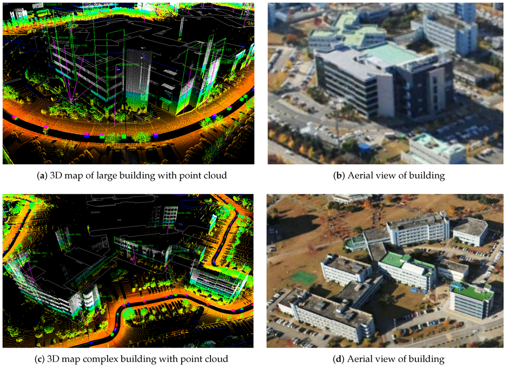 3D mapping result for sample buildings. Accumulated and refined point cloud using SLAM trajectory is given. (a) and (c) are the 3D mapping of two samples. Points are colored by the height, and green squares indicate the classified building walls. (b) and (d) are the aerial view of each sample building.