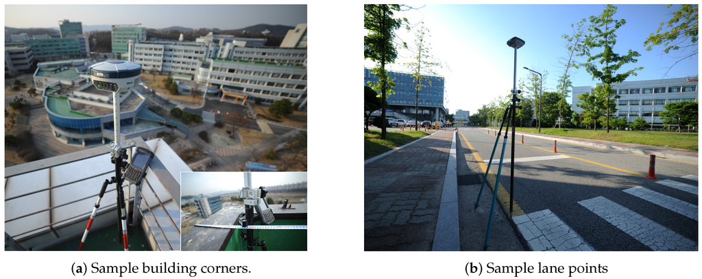 In the previous section, we have demonstrated consistency and qualitative evaluation. We also performed quantitative evaluation on the mapping results. Using RTK-GPS with 10 mm-accuracy, we analyzed the accuracy of the points from both sample buildings and lane maps. We use GRX2 by Topcon [56] in the RTK mode to measure ground truth point sampling. As shown in Figure 17, we measure sample points from both buildings and lanes.