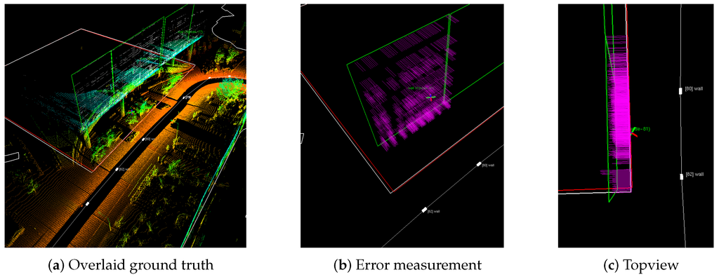 (a) Red square drawn from four sample ground truth corners. (b) By measuring perpendicular distance (purple line) from 3D point cloud to ground truth (red line) error is measured. (c) shows the topview for a clear illustration.