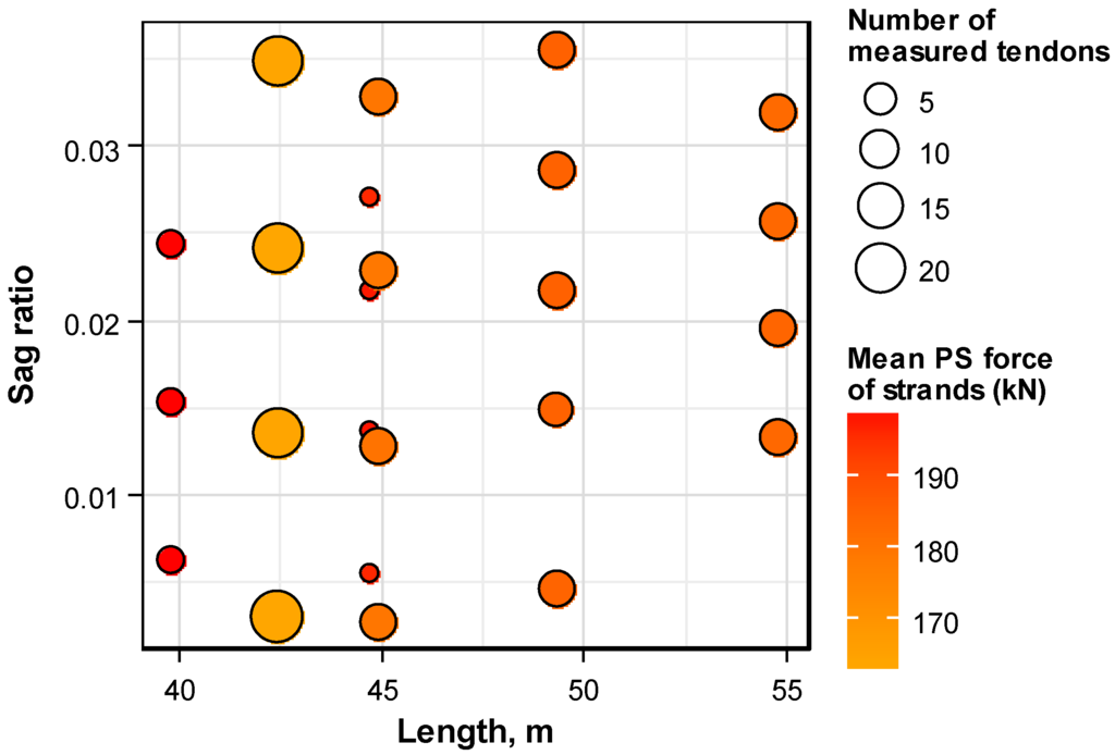 The last two columns of Table 1 arrange the mean of the mean prestress forces and the mean of the standard deviation of the prestress forces per anchor head by classifying the whole sets of measured data with respect to the girder length and tendon sag ratio. The distributions of the mean prestress force per anchor head have means ranging between 164 kN and 200 kN, and standard deviations ranging between 5.1 kN and 8.4 kN.