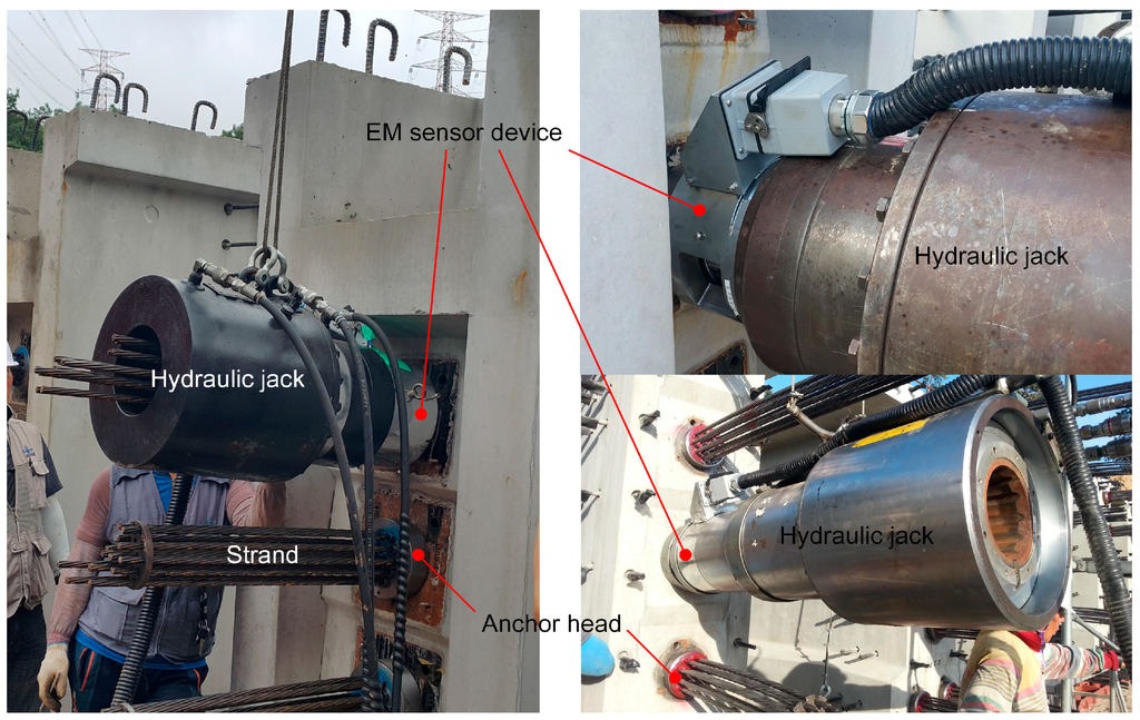 In this study, a special device (hereafter referred to as EM sensor device) was conceived to deposit EM sensors onto each strand so as to measure the prestress force in each individual strand of the multi-strand system. The EM sensor was fabricated to fit with the dimensions of the strands and anchor heads and was calibrated with respect to the strands used in each considered site. This EM sensor device was used to measure the prestress force in each strand by attaching it to the head of the hydraulic jack (Figure 3). The measured prestress force was thus the jacking force between the anchor head and the hydraulic jack.