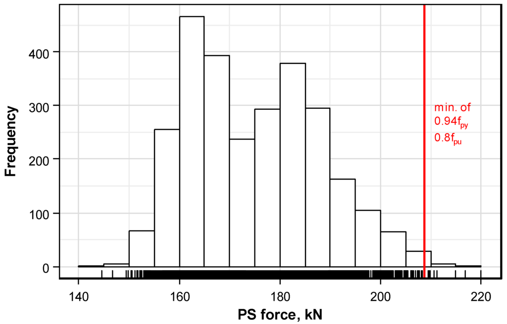 ACI 318-14 [9] limits the maximum tensile stress of the tendon due to jacking force during prestressing to a value below (where = yield strength), (where = ultimate strength), and a proposed value by the manufacturer. With a yield strength of 234.6 kN and ultimate strength 261 kN for a Grade 270 (1860) strand with a diameter of 15.2 mm, as specified in ASTM 416/416M [10], gives a maximum limit stress of 208.8 kN for the strand. However, as shown in Figure 6, some strands exceed this stress limitation. Even if the overall average of the mean prestress force per anchor head does not exceed the criterion, the prestress force of some individual strands exceeds the limit stress criterion. Accordingly, it is necessary to limit the mean prestress force to a level that prevents the exceedance of the maximum limit per anchor head to solve this problem.