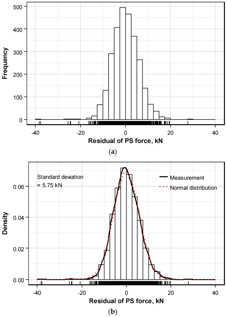 Distribution of residual prestress force excluding the mean prestress force from the prestress force of the strand: (a) Frequency distribution; (b) Density distribution.