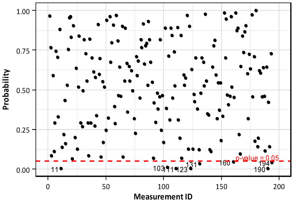 Figure 8 plots the normality test results relative to the 194 anchors considered in this study. It appears that only 8 data have significance probability lower than 5% while the other data present significance probability higher than 5%. Since only a very small portion of the data failed the normality test, it can be assumed reasonably that the distribution of the prestress force per anchor head follows the normal distribution.