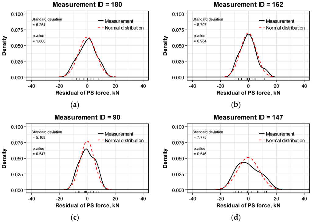 Since the histogram of the prestress force shown in Figure 6 may exhibit various distributions according to the level of the design prestress force, the prestress force per anchor head is decomposed as follows in order to exclude the influence of the design prestress force.