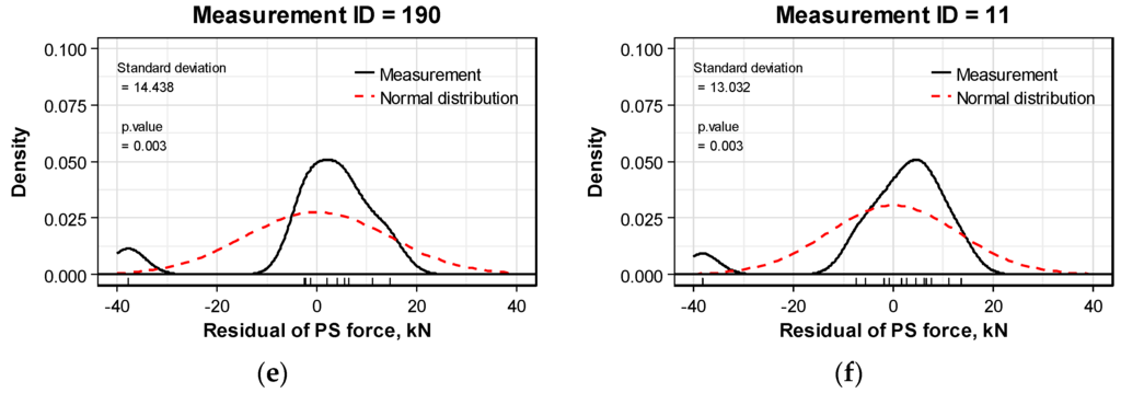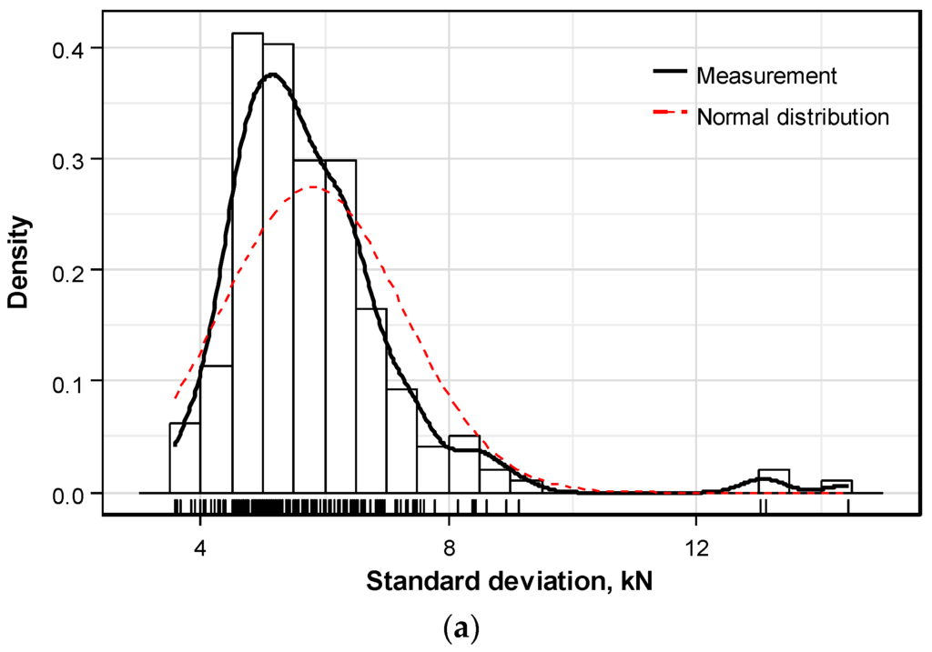 Consequently, compared to the normal distribution, the distribution of the standard deviation of the prestress force per anchor head excluding the outliers appears to be slightly skewed to the left and presents a long tail on the right.