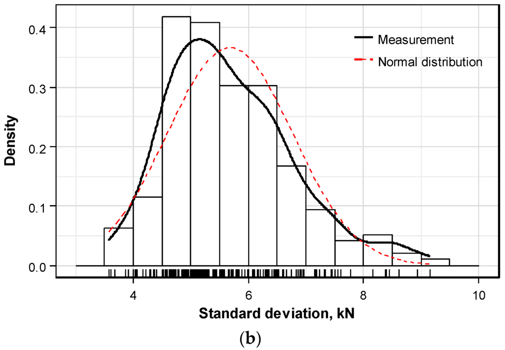 Figure 10 plots the density histograms of the standard deviation per anchor head. Figure 10a relates the distribution for the whole set of data and Figure 10b is drawn when the 3 outlier data sets are excluded from the considered data. It appears that the distribution of the standard deviation for the whole set of data, including the outliers, has mean of 5.80 kN and standard deviation of 1.45 kN, whereas the same distribution for the data excluding the outliers has mean of 5.67 kN and standard deviation of 1.09 kN. This indicates that large distortion is generated by the 3 outliers. As shown in Figure 9c, these 3 outliers correspond to the computation of a large standard deviation caused by the loose arrangement of some strands in the tendon. However, such misplacing of a part of the strands can be attributed to careless prestressing work and should not occur in cases of appropriate prestressing. Accordingly, these 3 outliers are discarded from the subsequent analysis.