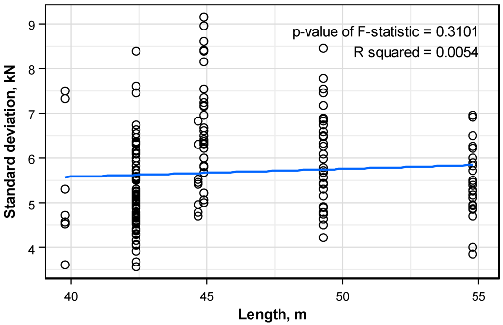 Figure 11 plots the distribution pattern of the standard deviation of the prestress force per anchor head with respect to the length of the structure. The dots indicate the distribution of the standard deviation and the solid line figures the linear trend line. The pattern of the distribution of the standard deviation does not show particular tendency according to the increase of the structure length. In addition, the p-value of the F-statistic indicating the validity of the regressive line is smaller than 0.05 and shows that the regressive line is not valid. Therefore, it can be concluded that the length of the structure has practically no effect on the standard deviation.