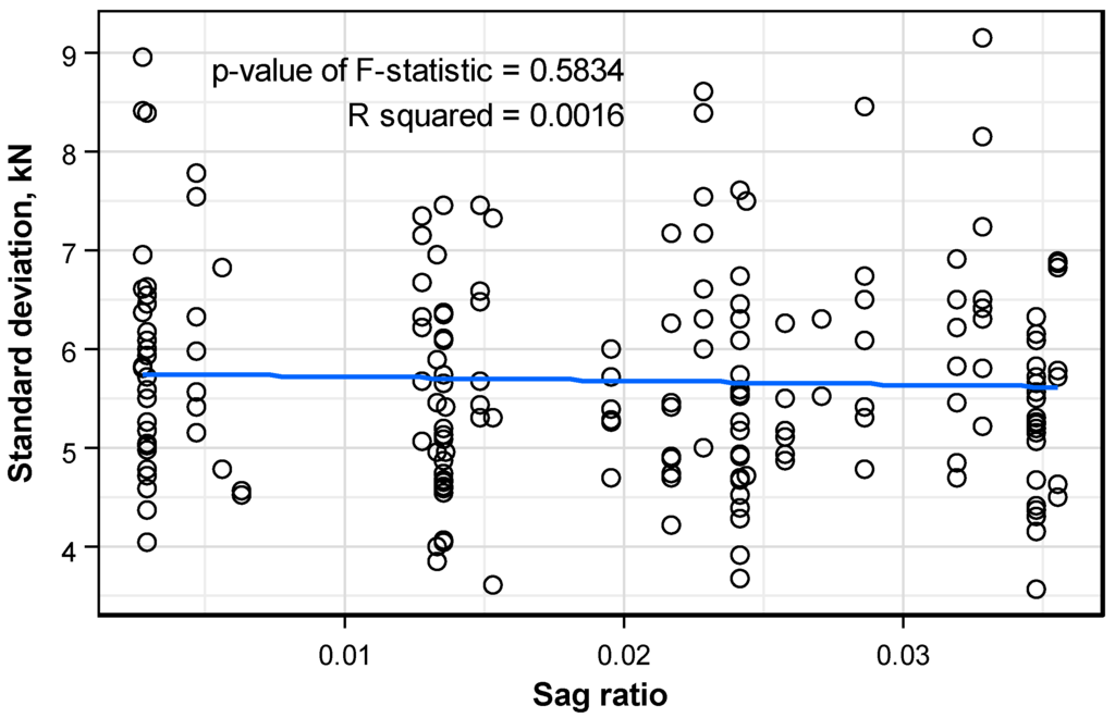 Figure 12 plots the distribution pattern of the standard deviation of the prestress force per anchor head with respect to the sag ratio of the tendon. In this case, the standard deviation seems to reduce with larger sag ratio, but very slightly and without clear trend. Moreover, the regressive line appears to be invalid since the p-value of F-statistic is smaller than 0.05. Accordingly, similar to the structure length, it can also be concluded that the tendon sag ratio has practically no effect on the standard deviation.