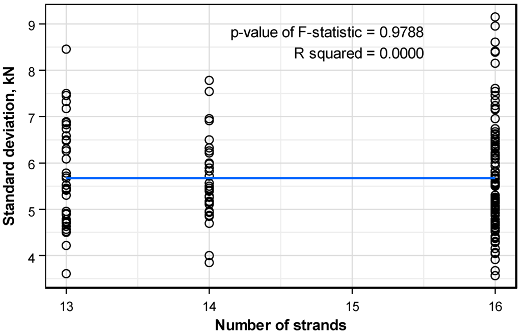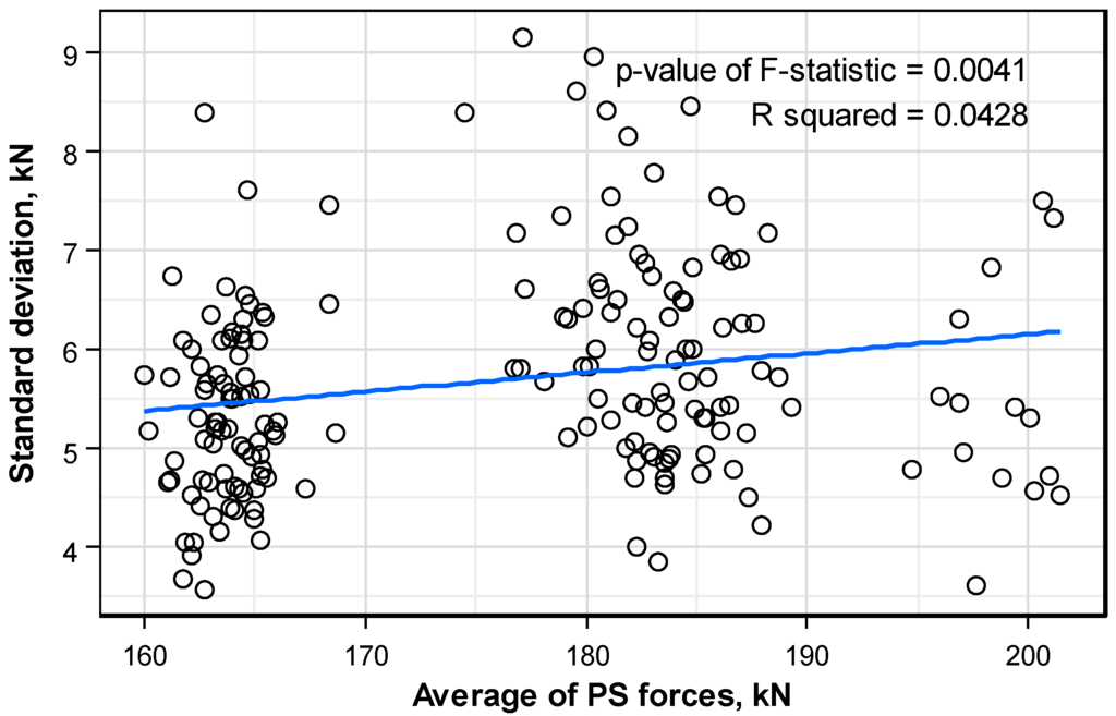 Figure 14 plots the distribution pattern of the standard deviation of the prestress force per anchor with respect to the level of prestress per anchor. Unlike the precedent factors, the level of the prestress force appears to influence the distribution of the standard deviation of the prestress force per anchor head. In addition, the p-value of F-statistic indicates the validity of the regressive line with a value smaller than 0.05. Concretely, higher level of prestress tends to gradually increase the standard deviation of the prestress force. However, the R squared relative to the regressive line indicates poor suitability with a value of about 0.04. This means that the unquantifiable skill and practice of the technician has a larger influence on the standard deviation relative to the distribution of the prestress force per anchor than the factors considered in this study.