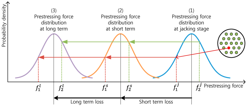 Considering that the prestress force measured by the smart strand has changed by from the prestressing stage to a definite time, it is reasonable to assume that the distribution curve of the prestress force has also translated by during that period. Even if the change in the distribution of the prestress force can be computed more accurately considering the deformation inside the section of the structure, increasing the accuracy is not worth the effort since the distribution pattern of the prestress force is approximated as a normal distribution. Accordingly, the changed mean prestress force at the considered time becomes . Noting that the standard deviation has not changed, this means that the distribution of the prestress force at this time can be estimated by the normal distribution [5].