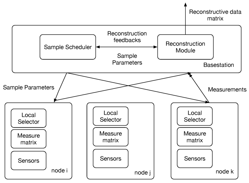 Figure 1 presents the system architecture of a typical WSN running CS-collector to collect sensor data in an energy efficient way. In the base station, the sample scheduler decides the sampling parameters and some global control information like the compression ratio at local sensors, the schedule of time slots for each sensor to submit their compressed data and the random projection matrix used to compress the time-series data. Each local sensor compresses time series-data sensed and transmits the compressed data vector to the base station at its assigned time slots. When the base station receives compressed data vector from multiple sensors, it operates optimization to recover the original signals of the whole WSNs.