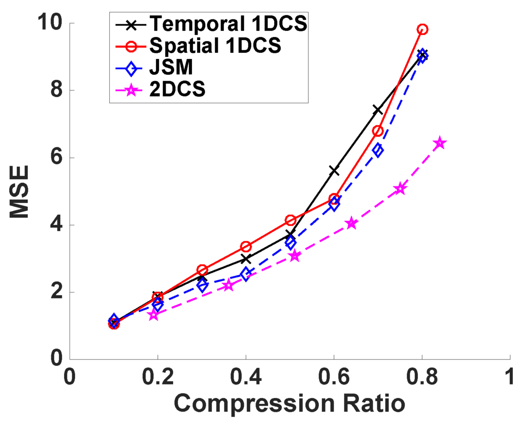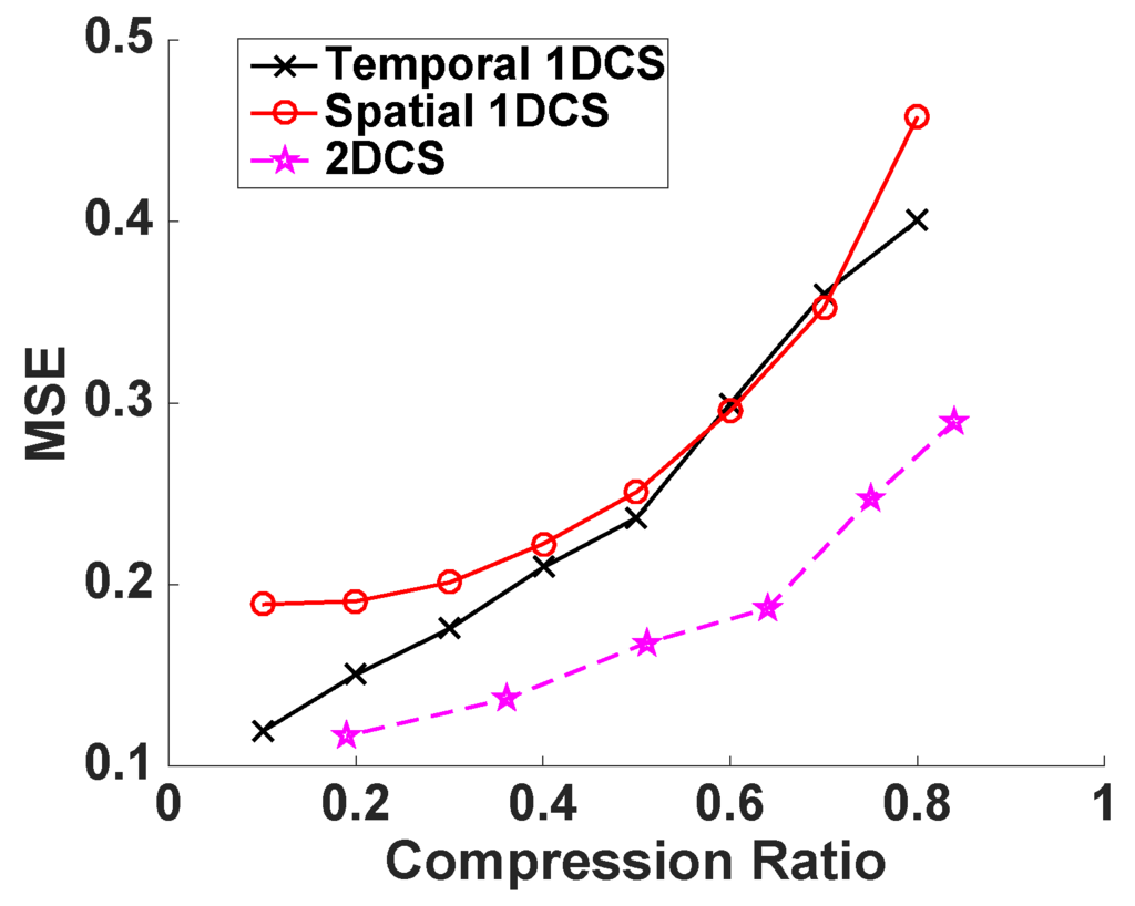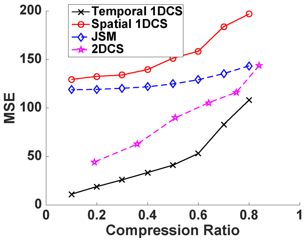 where is the Frobenius norm of the error matrix. We express the reconstruction accuracy of different data compression methods as MSEs under different compression ratios, where lower MSE stands for higher reconstruction accuracy achieved. The compression ratio is defined as