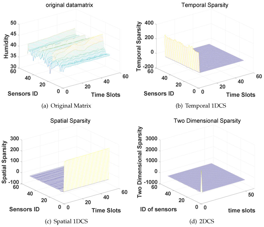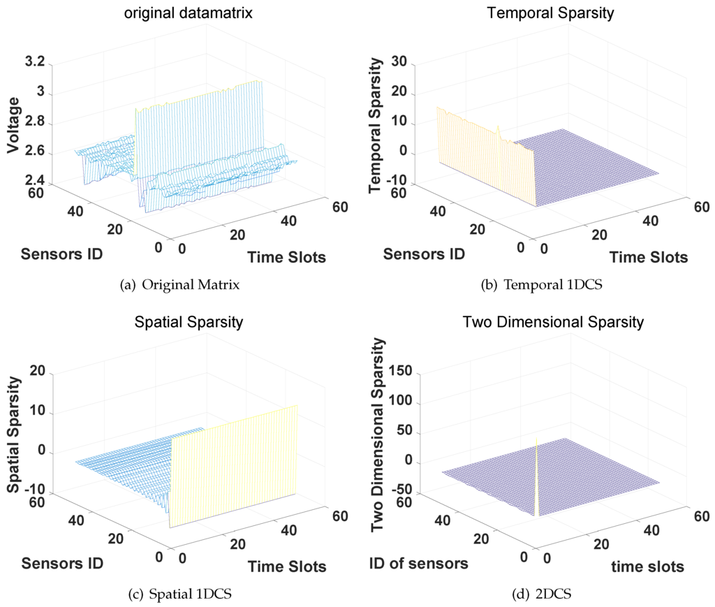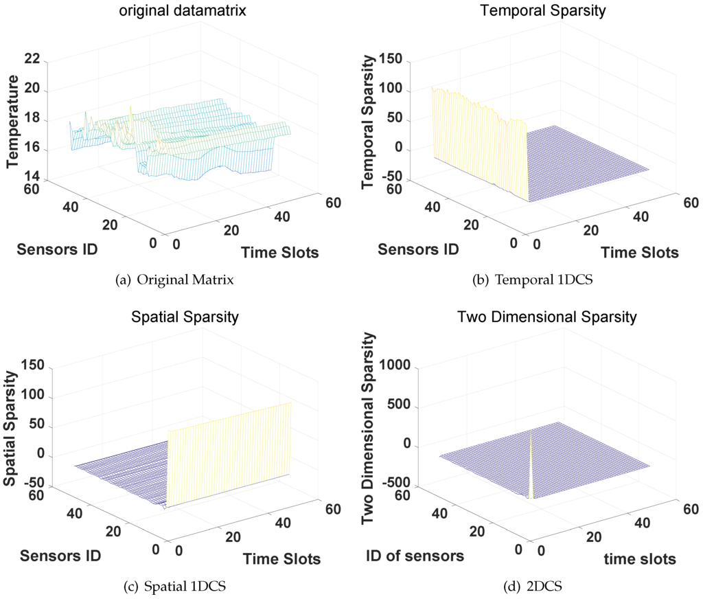Traditional data collection approaches sample signals at a frequency of at least Nyquist rate (i.e., twice of the highest frequency of the original signal) or above. However, natural signals collected from WSNs usually have relatively low information content as measured by the sparsity of their spectrum []. The theory of CS suggests that randomized low-rate sampling may provide an efficient alternative to high-rate uniform sampling by exploiting the prior of sparsity when recovering the original signals. The applications of CS in WSNs have been investigated extensively. The goal of applying CS on resource-constrained WSNs is to improve the accuracy of recovering the profile of the physical phenomena meanwhile reducing the amount of data transmitted through the network [,]. However, most of the WSNs monitor the temporal-spatial profile of the physical phenomena whose temporal and spatial spectrum can be sparse simultaneously while the current CS-based data collection methods in WSNs only consider the sparsity in either temporal or spatial dimension.
