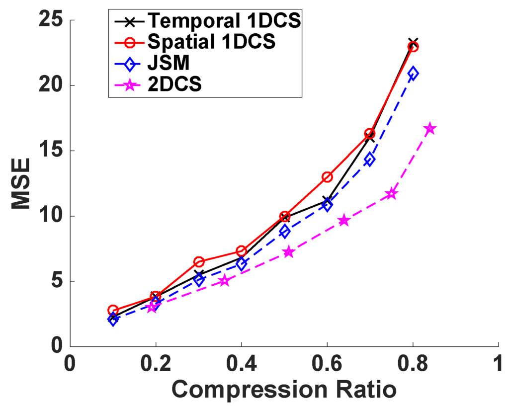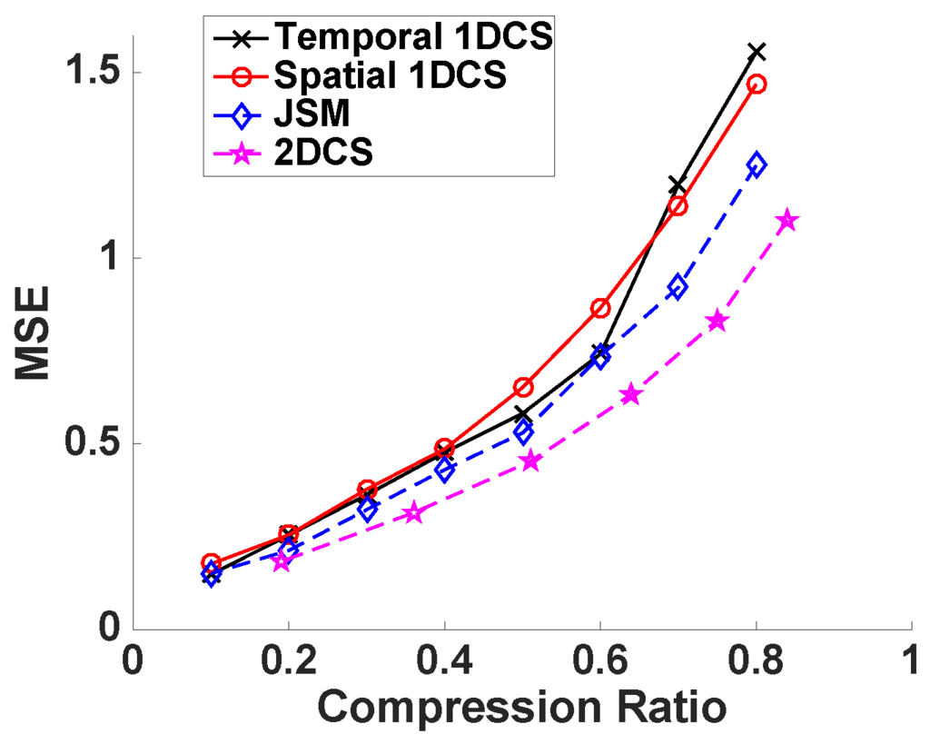 After verifying the three types of sparsity of the temperature data matrix in the DCT domain, we compare the reconstruction accuracy of the four CS-based schemes. We apply magic to solve the corresponding optimization problems because it has been compared with different state-of-the-art solvers in [], and the results demonstrate that it provides the best reconstruction accuracy. We gradually change the compression ratio from to and use MSE as the performance evaluation metric. The trials are repeated 30 times and different random projection matrices are generated for each trial. Then, the average MSE over the 30 trials are computed, and the results are shown in Figure 5. We can observe from Figure 5 that CS-collector, based on 2DCS, reduces the average MSE compared with the other two 1DCS approaches and JSM. The performance gain increases dramatically when the compression ratio is high. In other words, with the same goal of reconstruction accuracy at the base station, CS-collector is able to reduce the data transmitted (corresponding to the high compression ratio) through the network so that the overall energy consumption can be reduced, and the lifespan of the WSN is increased.