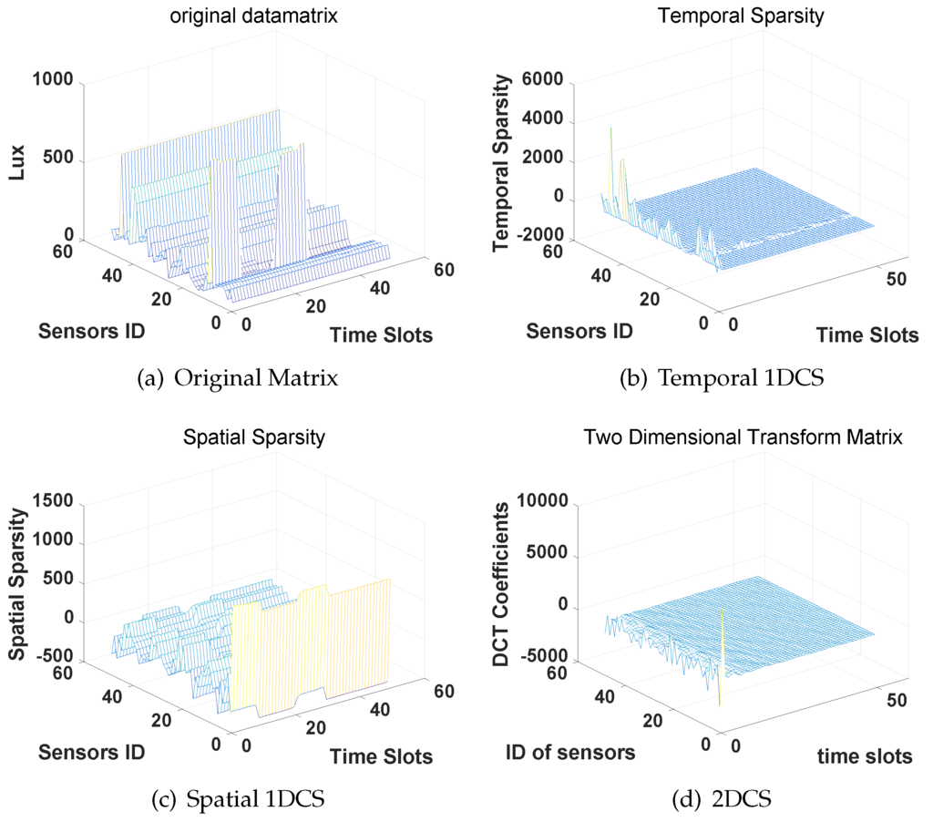 Therefore, we should investigate the sparsity property of the sensors data before determining which data collection strategy should be adopted. This can be easily achieved by collecting some data samples and conducting some simulations beforehand. Then, the 2DCS based CS-collector should be selected when the sensors’ data satisfies 2D-sparsity.