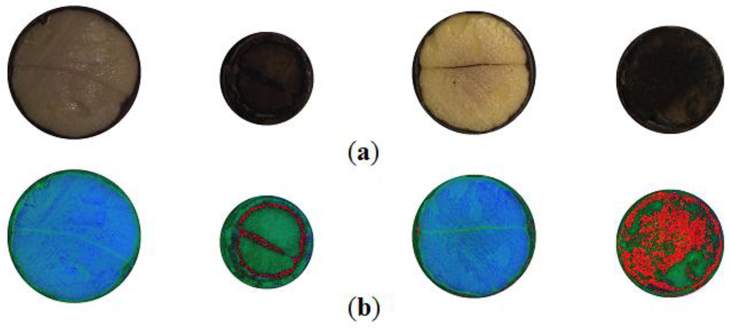 Selected segmented cross-section, Id. (from the left): 197, 200, 201, 206: (a) images captured by machine vision camera; (b) preview of HSV components rendered into RGB format.