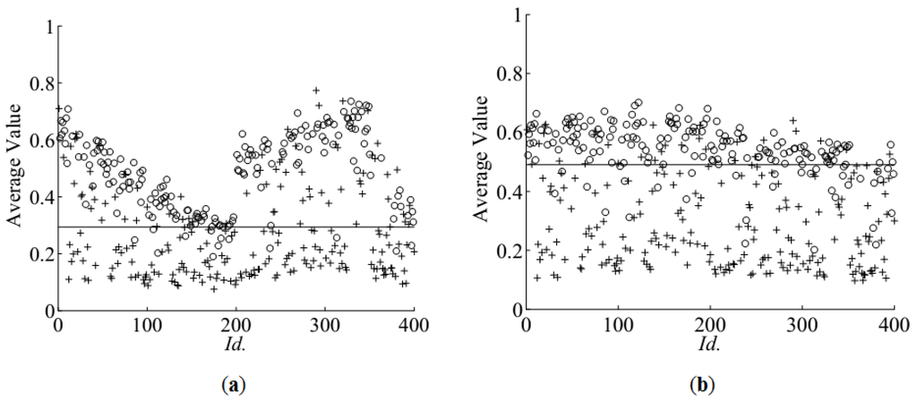 Figure 3a shows FavV for images of acorns transformed into HSV space—averaged values of the value component within circular areas of sections. Germinating ones are marked with an ‘o’ symbol, and the others with a ‘+’. One should note that for each input image, the identifier Id. in the range (1, 400) has been assigned in order to mark subsequent acquisitions. This character is used to track changes of ambient illumination during image acquisition across a few hours of the experiment performed outside the laboratory, i.e., in a greenhouse facility where seeds were sown immediately after scarification.