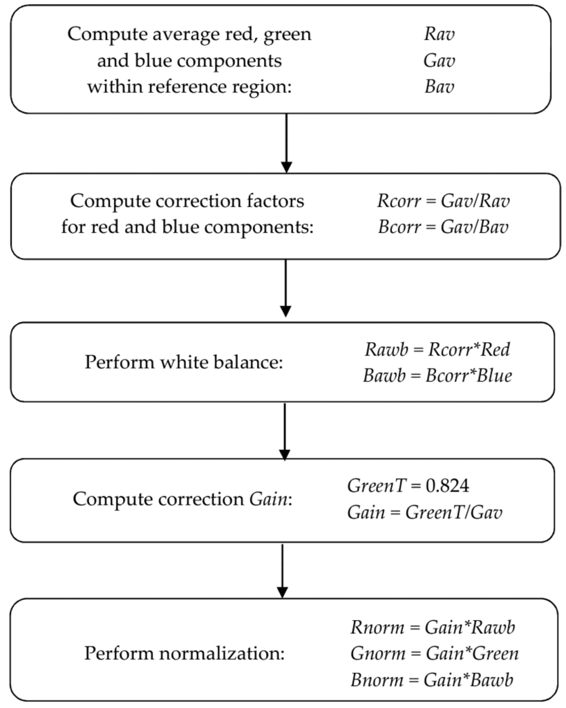 The diagram of the algorithm of an automatic white balance and brightness normalization.