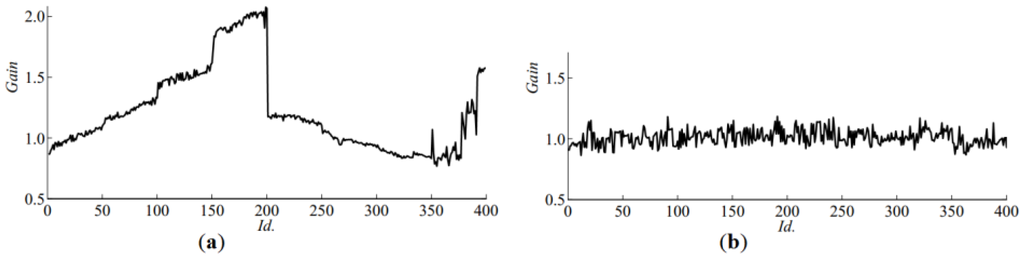 Value of correction gain factor in automatic normalization of images: (a) acquired by machine vision camera; (b) captured by high resolution camera.