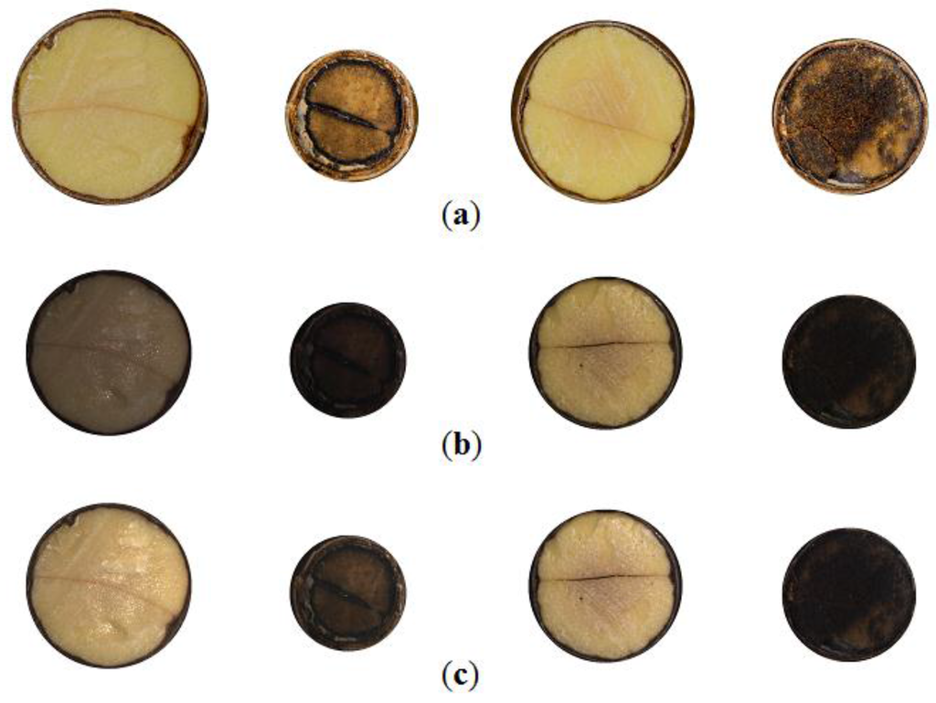 The impact of light intensity and its type is observable in the collected image sets. A directional spot light produces bright reflections when the moisture level of a scarified acorn is high, regardless of the presence of mummification changes. It should be noted that oak seeds fall into the ‘recalcitrant’ category. That is why, in order to retain their vitality, they require constant maintenance of their natural moisture—above 42% [38]. The traditional way of drying and storing acorns does not allow for obtaining homogeneous final moisture as the spoiled and half-spoiled seeds store water less well than healthy seeds [14]. The advantage of pictures captured with a high resolution camera is the uniformity of light produced by the circular illuminator. This means, however, that details distant from the camera are equally represented in the images. This applies particularly to spaces between the pericarp and cotyledons, between the cotyledons when they are not adjacent, and also between the pericarp and the holder in which the acorn remains during image acquisition. The intensity of these regions remained low when a directional spot light was used.