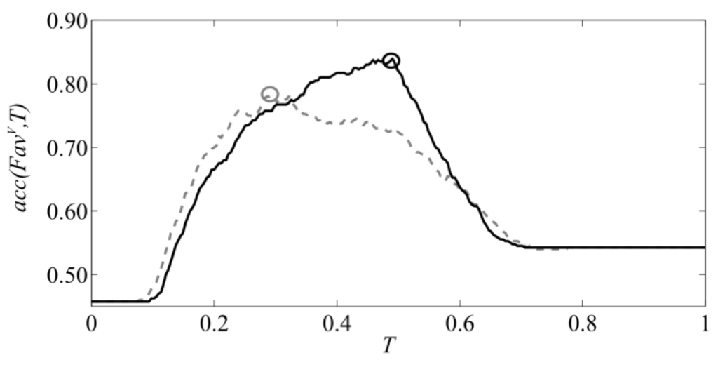 In order to perform binary classification, accuracy ACC = max(acc(FavC,T)) defined by Equation (2) was used as a measure of performance [17,36,37], where average components FavC of all sections and T fall into range (0.0, 1.0). It takes into account both the positive and negative predictions equally. The best threshold Thr that divides the 400 sections into two classes is the level T for which the accuracy of discrimination using particular feature FavC (where C designates one of seven components: hue, saturation, value, red, green, blue or grey) gains maximum value. It is searched by subsequent application of T level starting from 0.0 and incremented with equal step 1/255, which is correct for popular 8-bit representation.