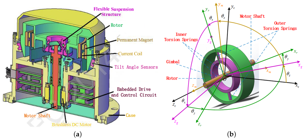 The computer-aided design diagram and simplified structure of the GW are shown in Figure 1a,b, respectively. The GW system mainly consists of the following subassemblies: case, motor, flexible suspension structure, flywheel rotor, torquer consisting of current coil and permanent magnet and tilt sensor. Among them, the case is fixed on the carrier, such as spacecraft. The flexible suspension structure is made up of gimbal, inner and outer torsion springs, as shown in Figure 1b; the gimbal is connected to the motor shaft by a pair of inner torsion springs, and the rotor is connected with the gimbal by a pair of outer torsion springs. The rotor driven by the brushless DC motor rotates in a high time-varying speed. Thus, the torque along the spin direction of the rotor can be generated by adjusting the motor speed. Two pairs of torquers perpendicular to each other can provide two-dimensional tilt control torques to make the spin axis of the rotor tilt along the radial directions. Due to the existence of the angular momentum, the radial control torques can be outputted based on the CMG principle. The tilt sensors are designed to measure the tilt angles of the rotor relative to the case. The special physical structure of GW determines that the device can realize the functions of the sensor, like DTG, and the actuator, like VSCMG, at the same time.