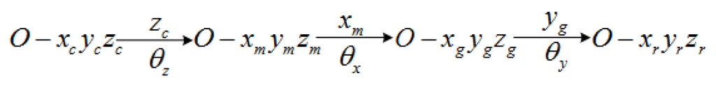 Four body frames and three generalized coordinates are given in Figure 1b for deriving GW dynamics equations using Lagrange’s method. The four body frames are the case frame (:O-), the motor body frame (:O-), the gimbal body frame (:O-) and the rotor body frame (:O-), respectively. The coordinates () are the defined generalized coordinates, where and represent the rotation angles of the inner and outer torsion springs, respectively, and represents the spin angle of the motor shaft. The relationship between these four body frames and the generalized coordinates can be further expressed by Figure 2.