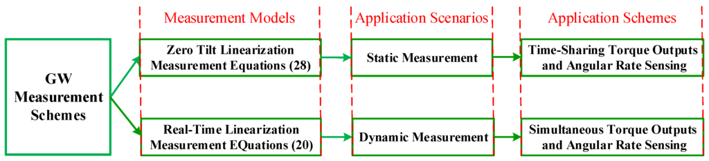 - Equation (28) is obtained by substituting the operating points at zero tilt angles into Equation (20), which are suitable for the arbitrary operating state of the rotor. Therefore, combining the analysis (1), in the smaller tilt range of the rotor, Equation (28) is utilized to realize the spacecraft angular rate sensing with GW. However, when the tilt angles of the rotor become larger, the measurement accuracy with Equation (28) cannot meet the indicator requirement without any error compensation. The applications of the real-time linearization measurement Equation (20) and small tilt measurement Equation (28) are analyzed in the following figure.