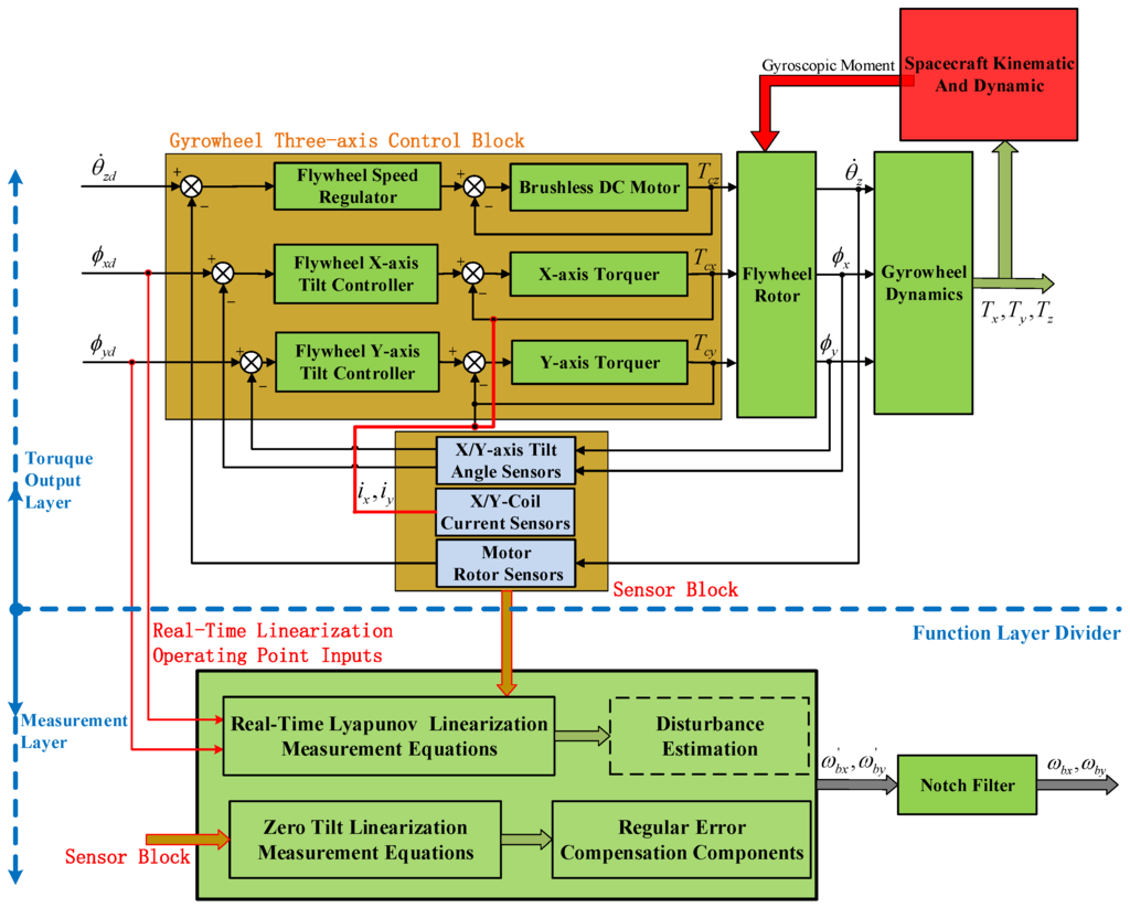 The measurement layer is designed to realize the angular rate sense of the spacecraft with the proposed measurement methods, which contains the real-time Lyapunov linearization Equation (20) and the small tilt linearization Equation (28). The tilt command inputs as the desired operating points are utilized to realize the real-time Lyapunov linearization measurement. The outputs of the sensor block are input to both measurement equations. As previously mentioned, the disturbance estimation (refer to [27,28]) should be studied further for Equation (20) in engineering. The regular error compensation is investigated for Equation (28) for compensating the errors due to zero tilt angle linearization.